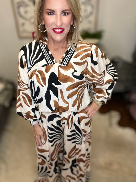 wide leg, ok to size down, elastic waist, pockets, can be part of a set