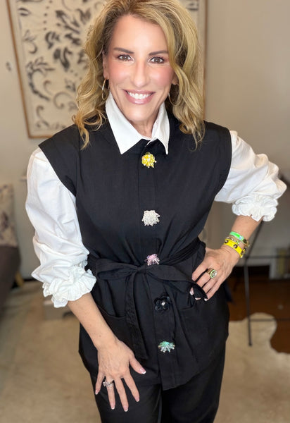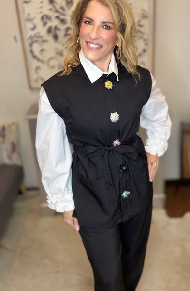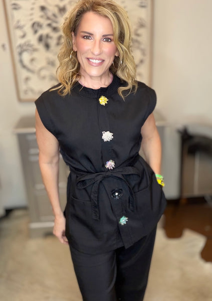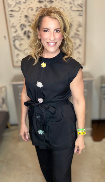 This stunning black 2-piece set is the definition of modern sophistication. The structured sleeveless top features a flattering high neckline, statement embellished buttons, and a self-tie waist that cinches perfectly for a tailored silhouette. Paired with sleek, coordinating black pants, this look transitions seamlessly from workday to dinner date.