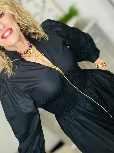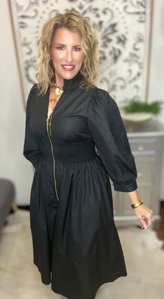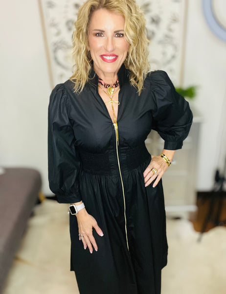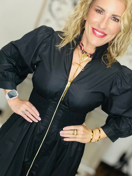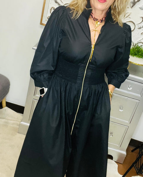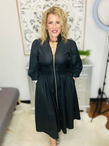 The dress in the image is a stylish, black, long-sleeve midi dress. It features a front zipper that runs from the neckline down through the waist, adding a sleek and modern touch. The bodice is fitted, with a gathered or smocked waistband that accentuates the waistline and provides a flattering silhouette. The sleeves are puffed at the shoulders, giving a voluminous and structured appearance, and taper slightly at the cuffs. The skirt has a gentle flare, creating an elegant and feminine shape. The fabric appears to have a smooth, slightly glossy finish, enhancing the dress’s chic and polished look.