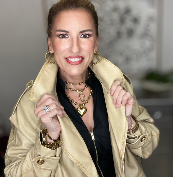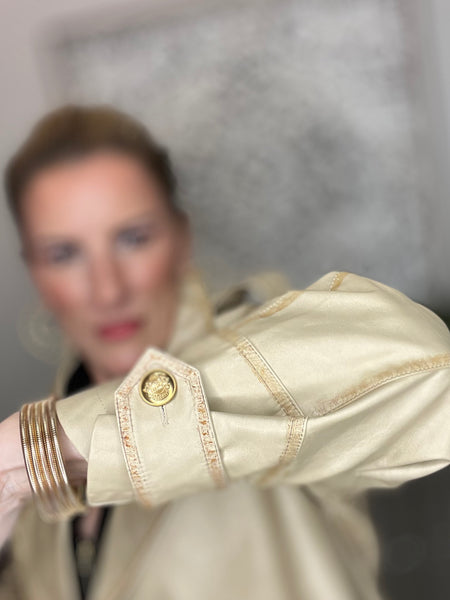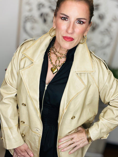 The coat  is a chic, light beige or cream-colored trench-style jacket made from faux leather with a soft sheen. It features a double-breasted front with large, gold-tone buttons that add a bold, luxurious touch. The design includes a wide notched lapel collar and structured shoulders, giving it a polished, tailored silhouette. There are side pockets and button accents at the cuffs for added detail. The coat is styled with gold jewelry, which complements the metallic buttons and enhances its sophisticated, fashion-forward appeal.