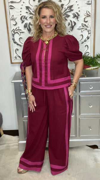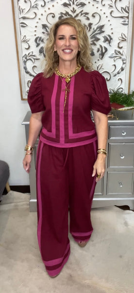 The blouse is a deep burgundy color with bold magenta geometric trim outlining the front and hem. It features short puff sleeves with gathered shoulders, adding a touch of volume and femininity.