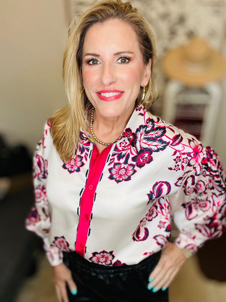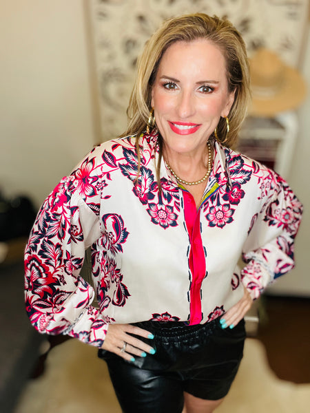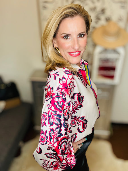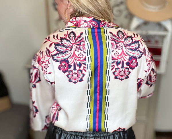 Beautiful print with stripe detail back( lime, royal and fuschia) Long sleeve button down 2 button cuff